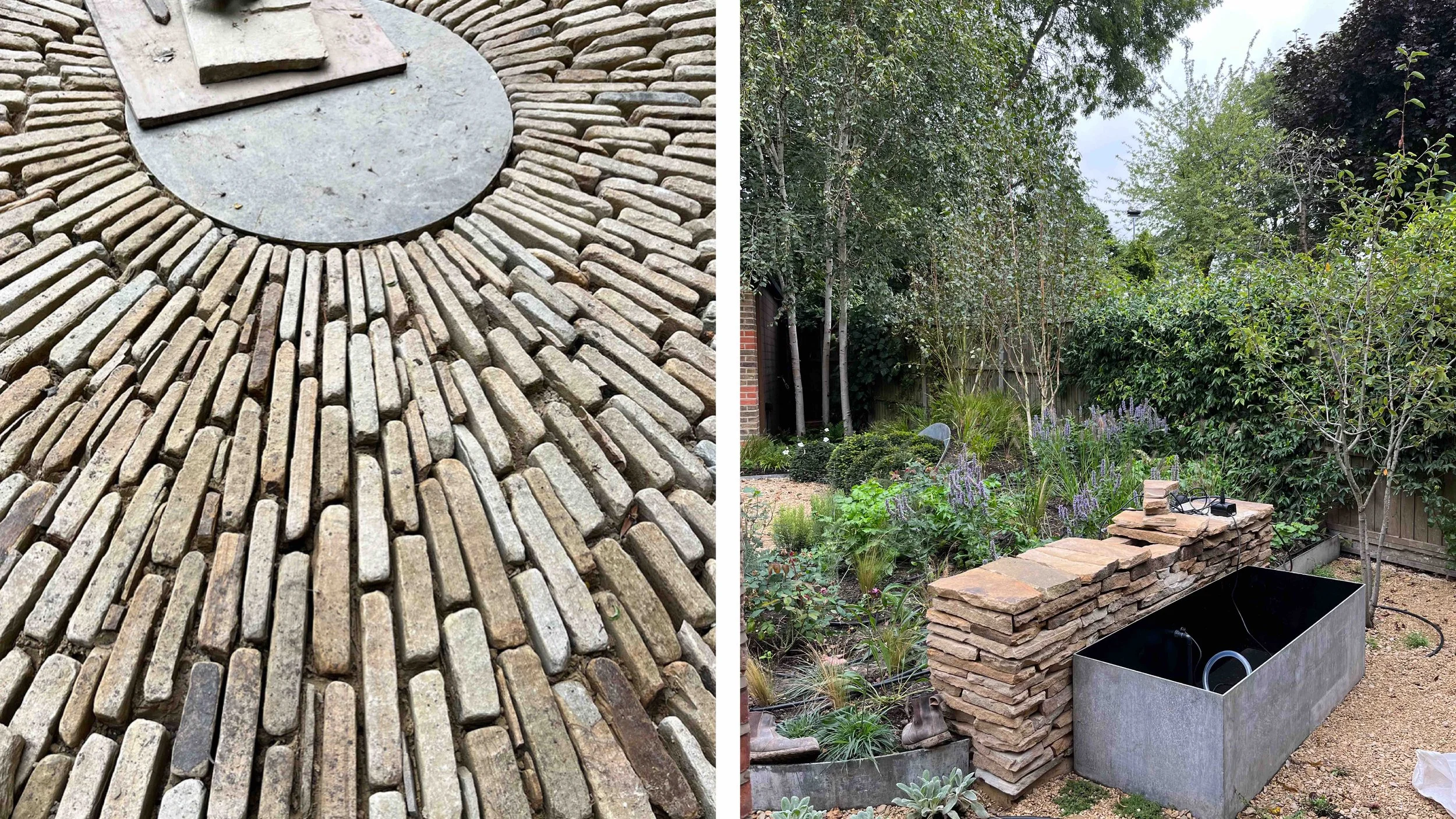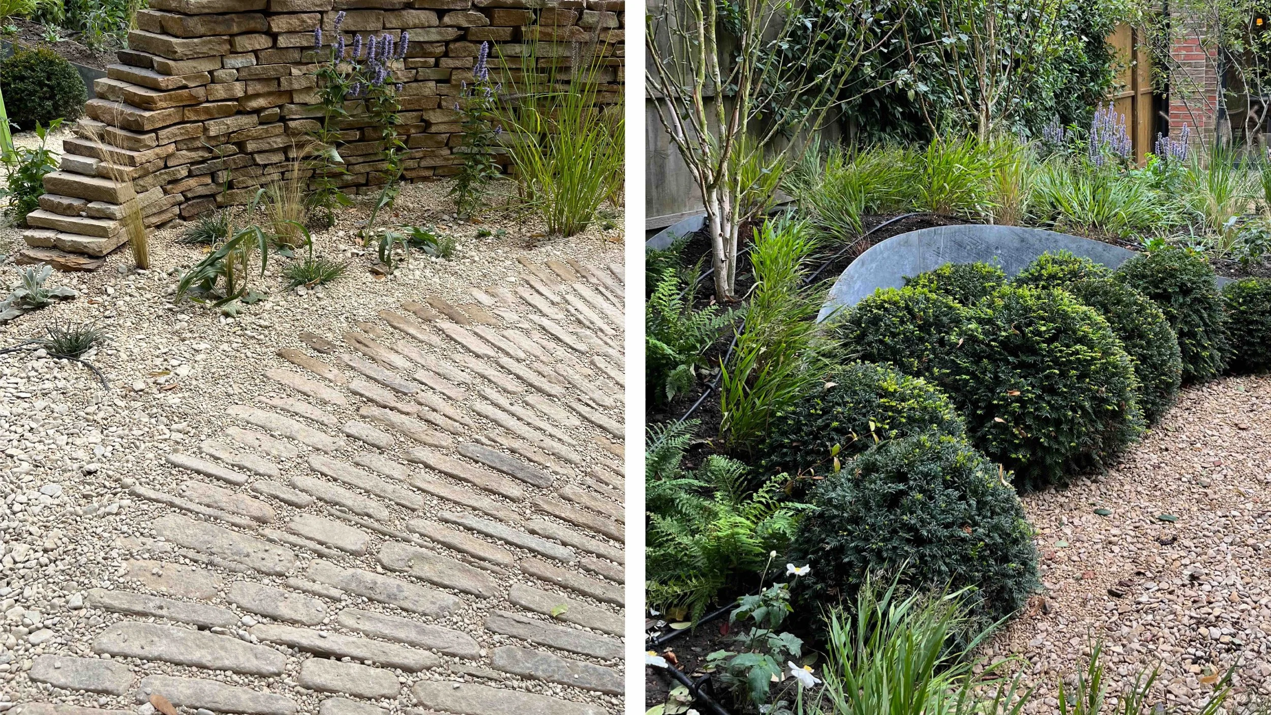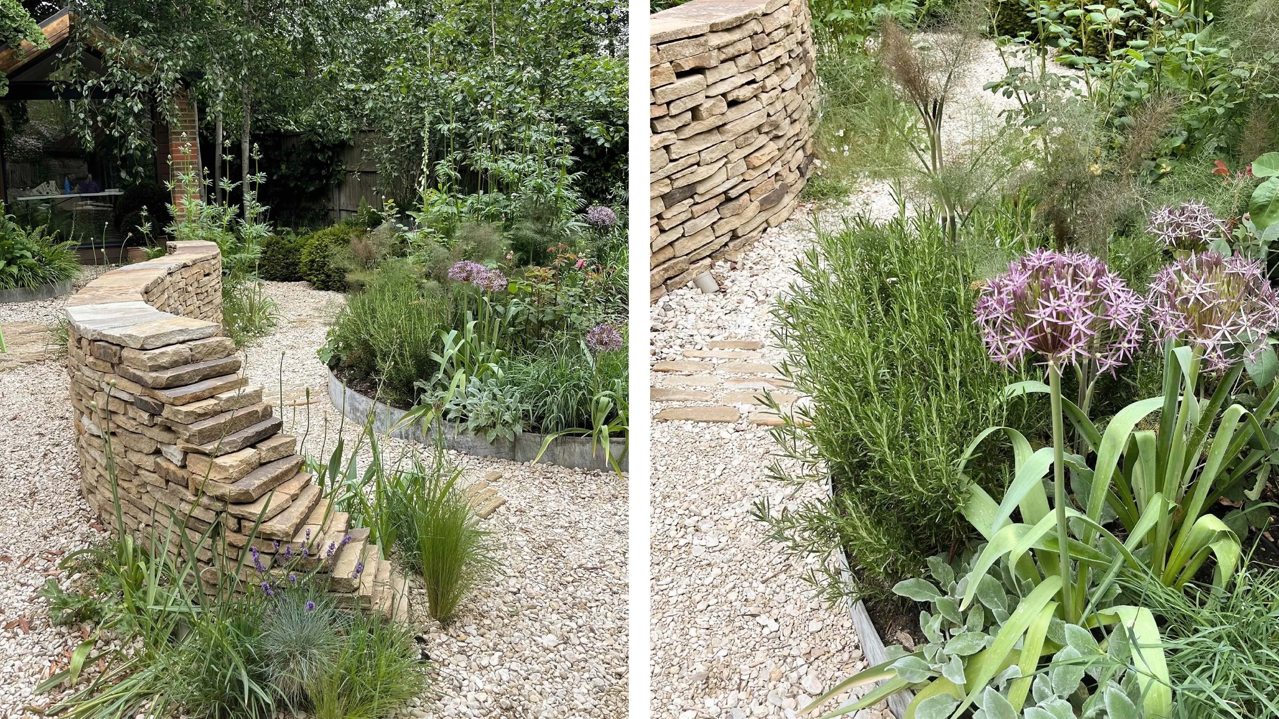 Curving pathways immersed in layers of planting and bound by a flowing drystone wall lead through the garden to a series of places to sit, cook, entertain, work and relax surrounded by sculptural and meadow like planting and the gentle sound of water from the trough. A garden not simply to look at, a place ‘to be’