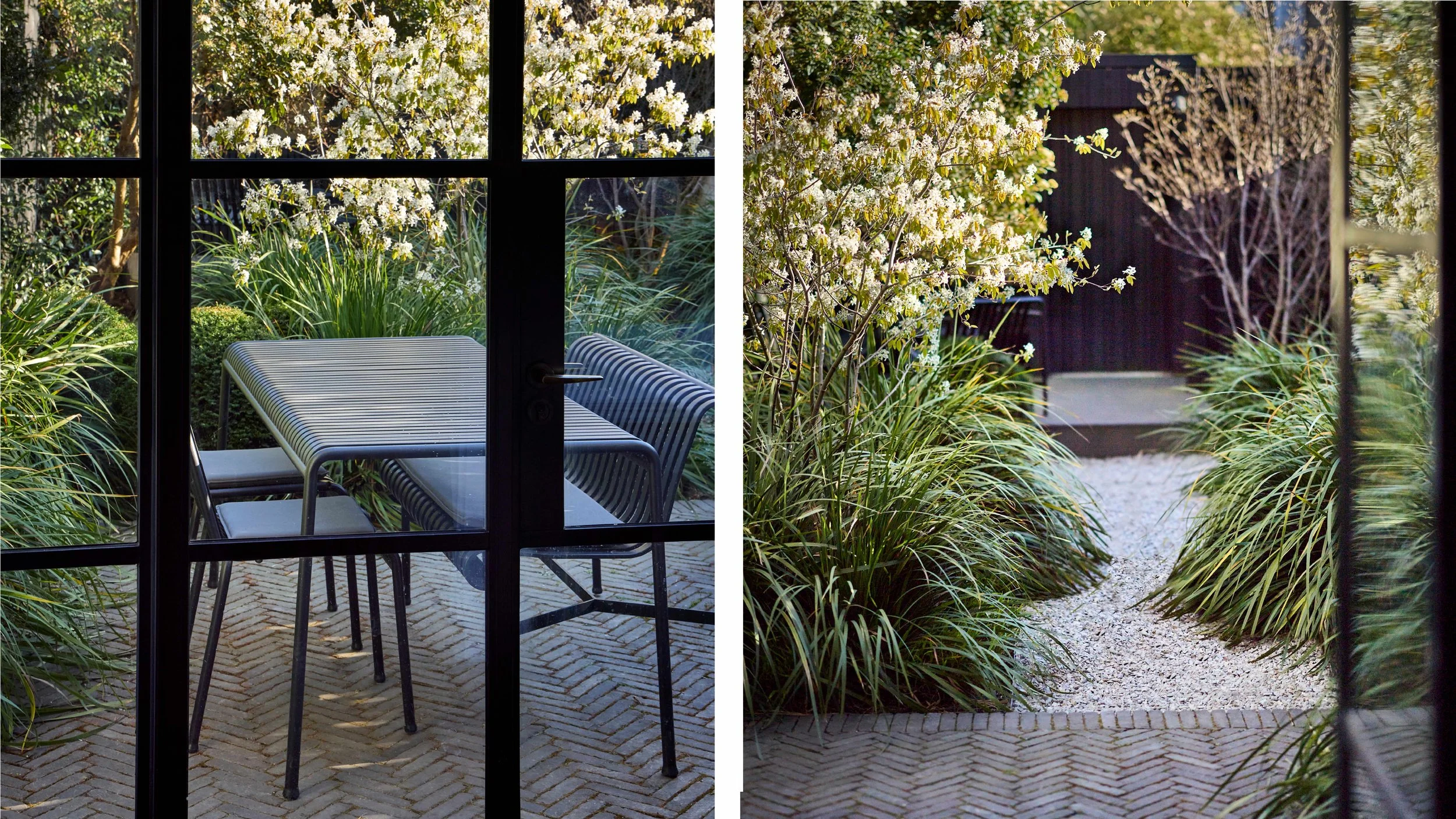 Clay pavers in a herringbone pattern form the dining terrace at the junction with the house echoing the dark parquet flooring. A simple gravel path leads through planting to a decked area with a bespoke timber garden store, and pergola with a ‘secret’ seating area cocooned amongst the greenery. Evergreen climbing Trachelsopermum surrounds the terrace in foliage and evening scent. Amelanchier and Cornus kousa trees are underplanted with sculptural Yew domes and grassy foliage from Libertia & Hakonechloa with bulbs emerging throughout the year for seasonality
