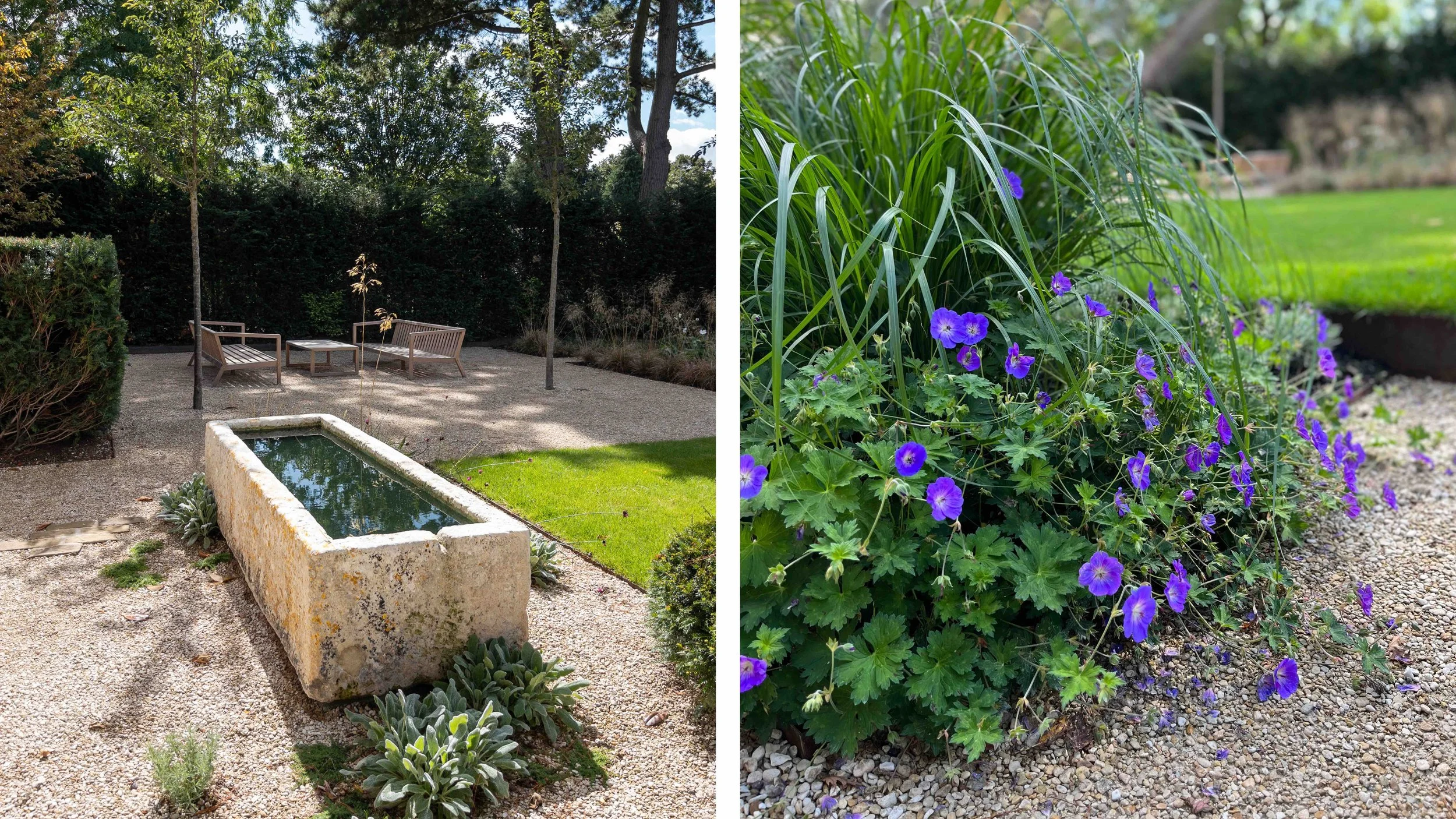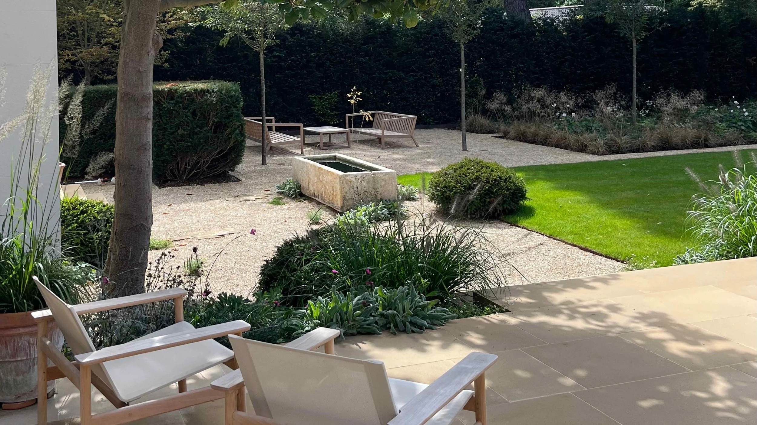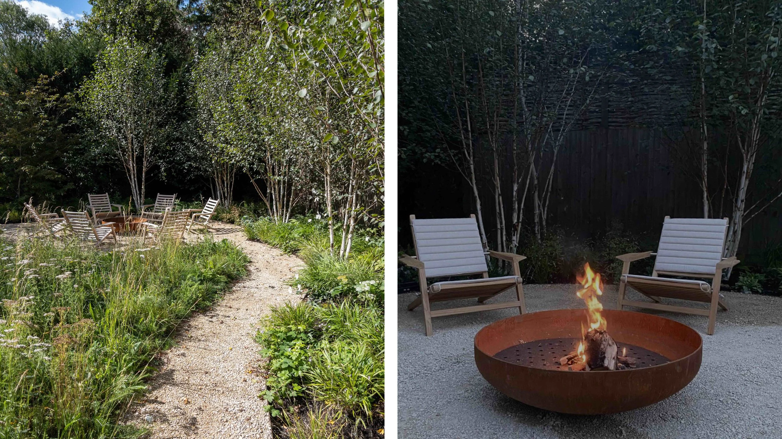 Tall Yew hedging follows the new curve of the driveway adding privacy and allowing for a semi shaded seating area within the garden close to an allée of Prunus yedoensis. The existing terrace was well located near the house but rather awkward in shape with changes in level and little relation to the house and the sightlines from the main entertaining rooms. This was rationalised to allow for a generous dining terrace surrounded by naturalistic planting with wide solid stone steps leading to a gravel garden and oversized antique stone trough. Further steps lead to a woodland garden surrounded by Birch trees, wildflower meadow and woodland underplanting with a relaxed fire pit area, a perfect place for the family to gather with their friends.